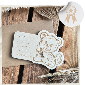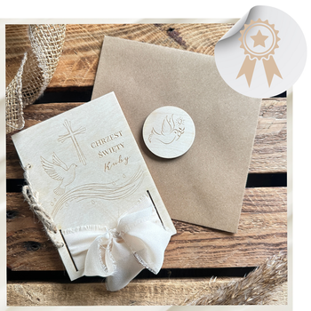 Drewniana Kartka na Chrzest Personalizowana Pamiątka Chrztu Świętego z Ozdobną Wstążką