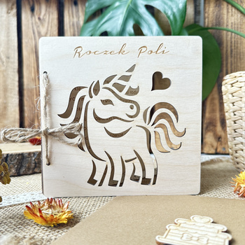 Drewniana Kartka na Roczek Pierwsze Urodziny dla Dziewczynki Jednorożec Grawer