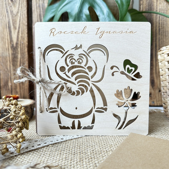 Drewniana Kartka na Roczek Pierwsze Urodziny dla Dziecka Słonik Grawer